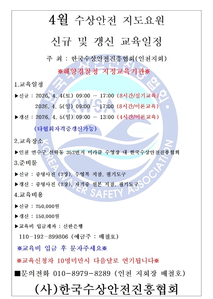 (인천지회) 4월 수상안전지도요원 신규(4월04~05일) 및 갱신 교육일정(4월05일)